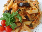 Пенне с баклажаном и моцареллой в томатном соусе.