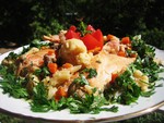 Рисовая лапша с куриной печенью и овощами, почти по-корейски.