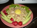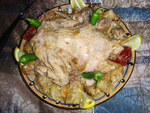 - свиная вырезка и куриное филе, одновременно запеченные с овощами и сыром в яично-молочном соусе