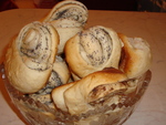 - На изгибе рулетика сделать глубокий надрез, не доходя 2 см до конца, и вывернуть две получившиеся половинки рулетика сахарной стороной наружу - получится плюшка в виде сердечка.
