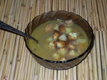 - В кипящее масло добовляем кубики батона, доводим до состояния сухариков, переодически перемешивая....