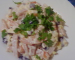 - Соединяем ветчину,сыр,помидоры и фасоль,всё перемешиваем,солим по вкусу,запровляем майонезом,ёщё раз перемешиваем.