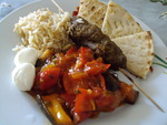 - На блюдо выложить запеченную питу,разрезанную на 4 части,кебаб,соус и рис.