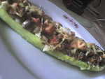 - Подойти к причалу, заполнить лодочки начинкой, посыпать нарезанным мелко чесноком и натертым сыром, добавить реку (стакан воды) и отправить в дорогу!!!! (предварительная разогретая духовка) на минут столько, пока лодочка не станет мягкой....
