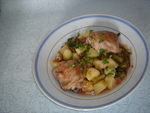 - Курицу залить кипятком и добавить картофель с фасолью.Посолить и поперчить по вкусу.