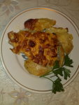 - Полученную массу выложить сверху на кусочки эскалопа, картофельные дольки обильно смазать майонезом.