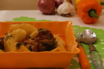 - добавить к мясу картофель.соус должен почти покрывать его.если нет.то необходимо добавить мясного бульона или горячей воды.
