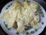 - Отварить мясо(лучше взять самое жирное,я добавляю в свинину ещё и сало,для большей жирности),посалить мясо немного больше чем вы солите обычно(вообще бешбармак варится из солёного,сушоного,мяса,поэтому солим немного больше обычного).И посоветую взять кастрюлю большего размера чтобы бульона получилось побольше,так как это блюдо будет основываться на бульоне.Порезать лук полукольцами(тоненько) выложить в глиняную посуду и залить готовым бульоном,добавить перчику чёрного,красного,кто что любит,закрыть крышкой и дать (запариться)настояться луку пока готовится блюдо.Замесить тесто,дать настояться под салфеткой 30-40 мин..Кортошку порезать на четвертинки - если картошка большая,если средняя то на пополам.Готовое мясо выложить на блюдо(в чём будет подаваться на стол)и разделить его на порционные кусочки,сварить картошу в том же бульоне где варилось мясо.Пока варится картошка,накотать из теста лепёшки(накатать потоньше) и порезать их на прямоугольники как на фото.Готовую картошку выложить на мясо и сварить в том же бульоне лепёшки,как только лепёшки всплыли вытаскиваем их и выкладываем на болюдо с мясом и картошкой.Поливаем сверху запарившимся луком и подаём на стол пока не остыло!