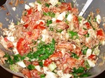 - Слить сок из баночки тунца и размять рыбку вилкой. Нарезать некрупно помидоры, круто сваренные яйца и зелёный лук. Добавить порезанный на тонкие полукольца и предварительно замаринованный в смеси лимонного сока и оливкового масла с добавлением молотых перцев. Мариновать минут 20. Аккуратно перемешать ингридиенты и посыпать петрушкой.