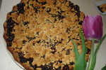 - Разделить тесто на 2 части.Форму для выпекания смазать маслом, слегка посыпать манкой. На тесто выкладываем большую часть теста, равномерно распределяем по форме и накалываем его вилкой. Распределяем насинку по тесту. Сверху натираем на терке оставшееся тесто.